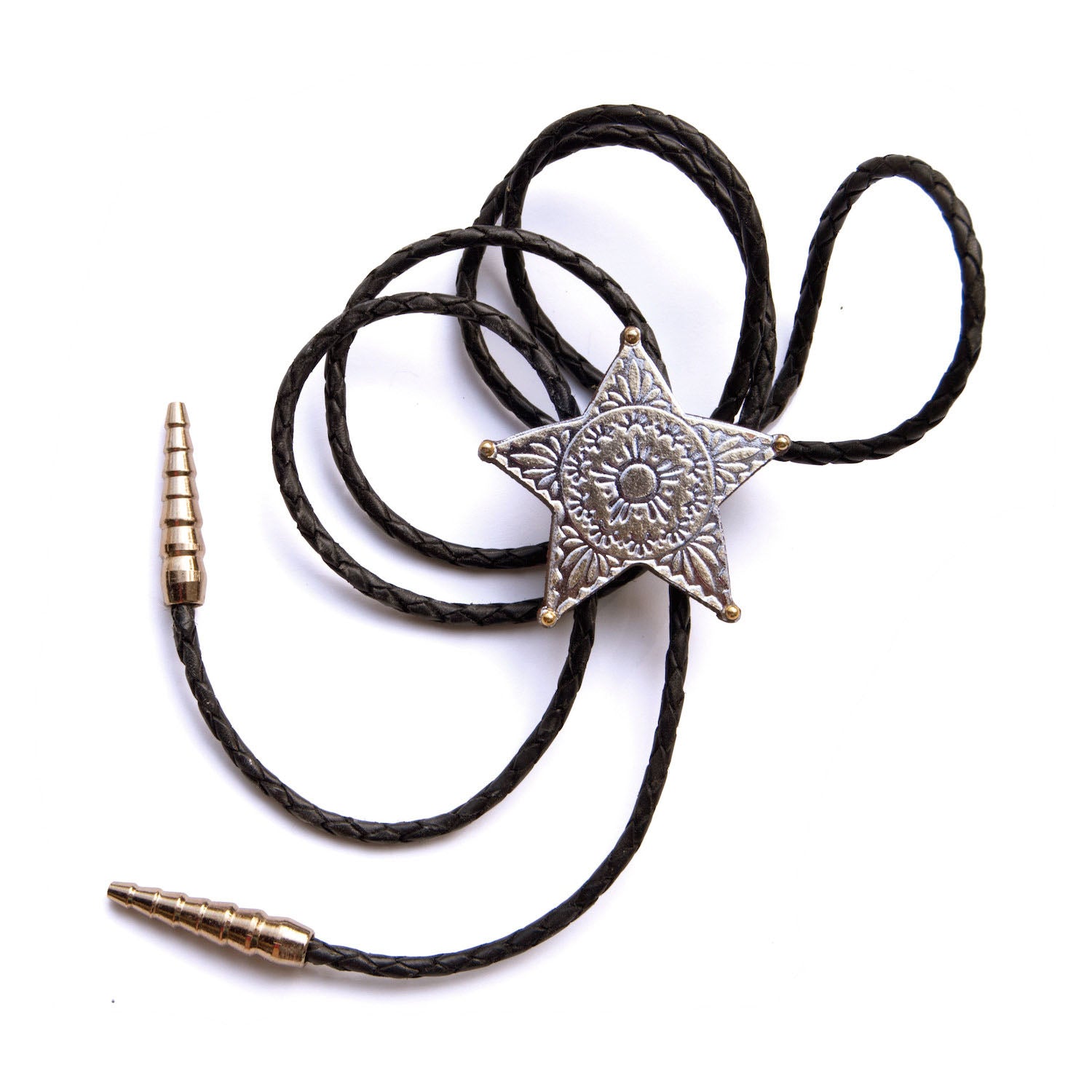 The star concho is mounted on a gold plated slider, on fine black braided leather cord, finished with gold plated graduated metal tips.