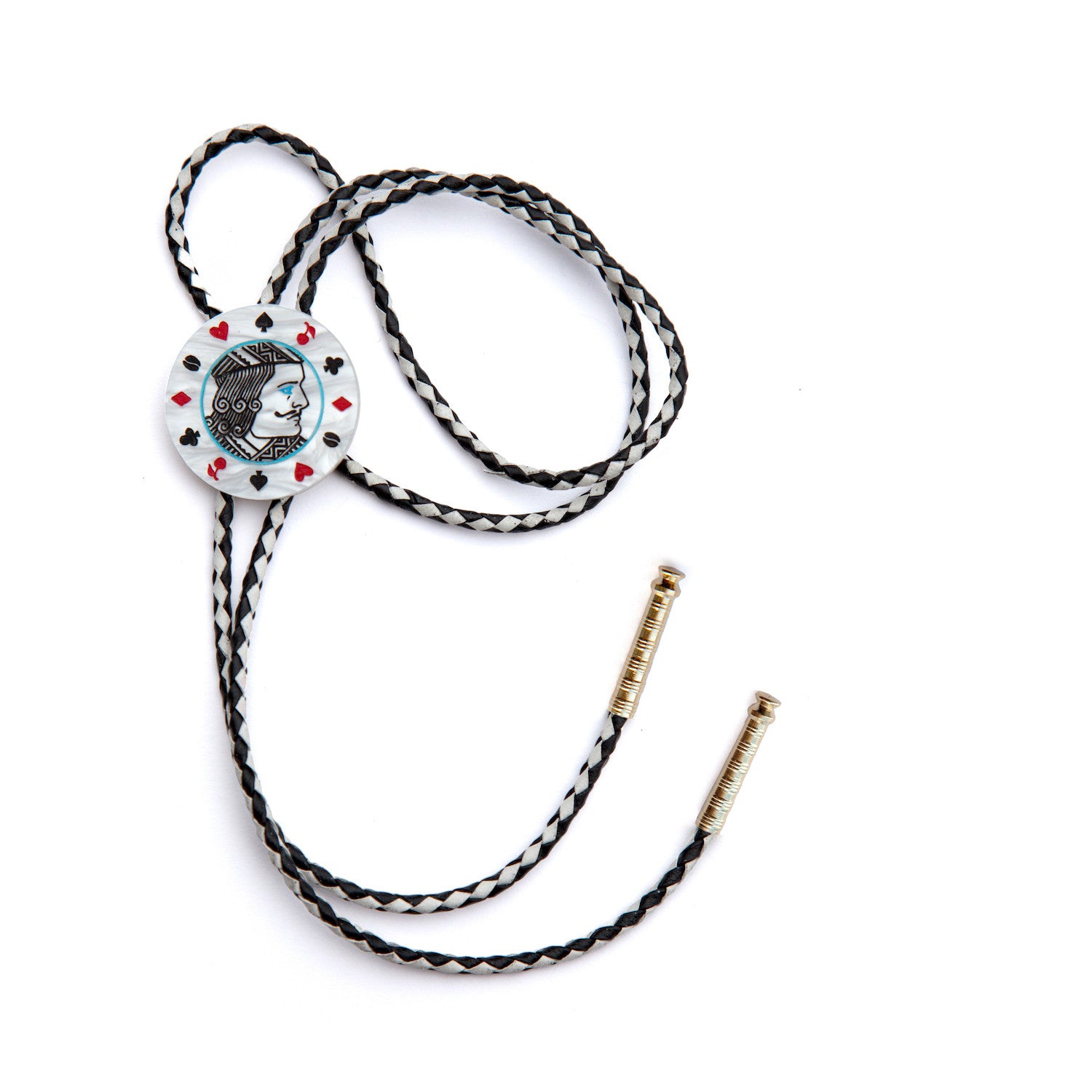 These casino chip bolos, in nod and a wink to One Eyed Jack's, are made from beautiful mother of pearl lucite, and adorned with a black Jack (doesn't he look almost exactly like our most special agent?), framed by a thin ring of neon blue, playing card suits, cherries & little black coffee beans. On the reverse is Waldo, the doomed witness, flanked by golden flames. The illustrations are machine-engraved before being carefully hand painted.