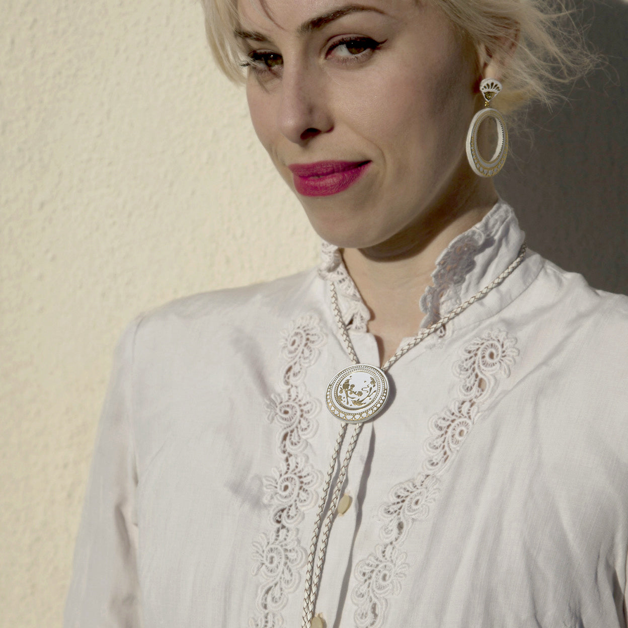 A smooth leather medallion, detailed in gold, sits on braided leather cord, ready to make your outfit!