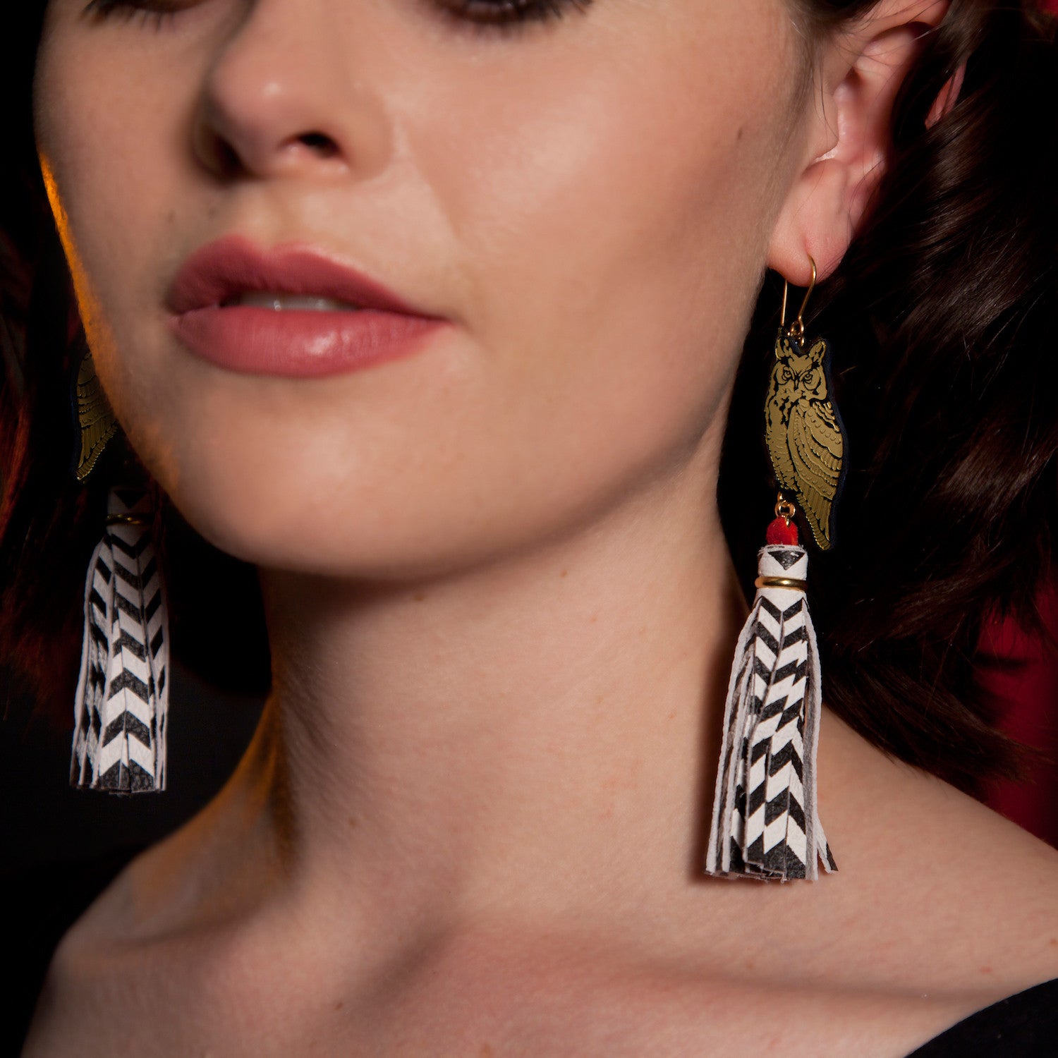 The tassels, inspired by the iconic black & white chevron floor of the black lodge, are screen -printed, hand-cut and held in place by golden rings (just as the disappearance of Coopers ring held his faith in the giants clues).