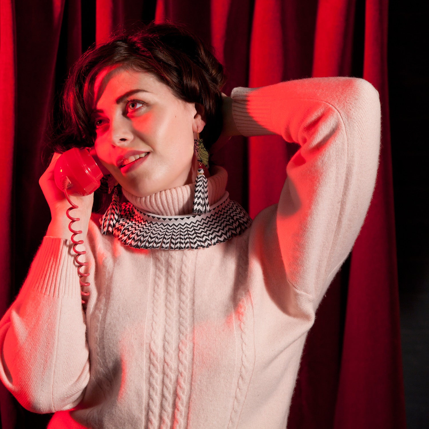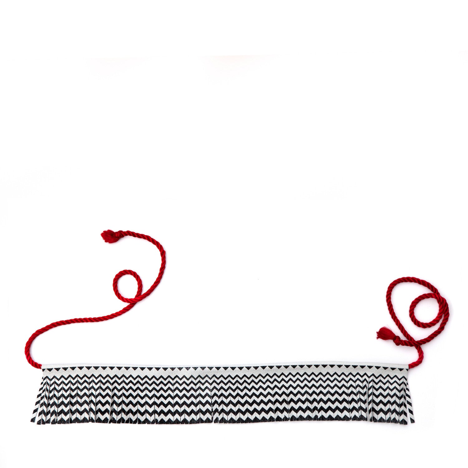 The iconic black & white chevron floor of the black lodge is translated into this luxurious soft, double layered suede leather fringe; screen -printed, hand-cut, and tied by hand-dyed ruby red 100% silk rope.