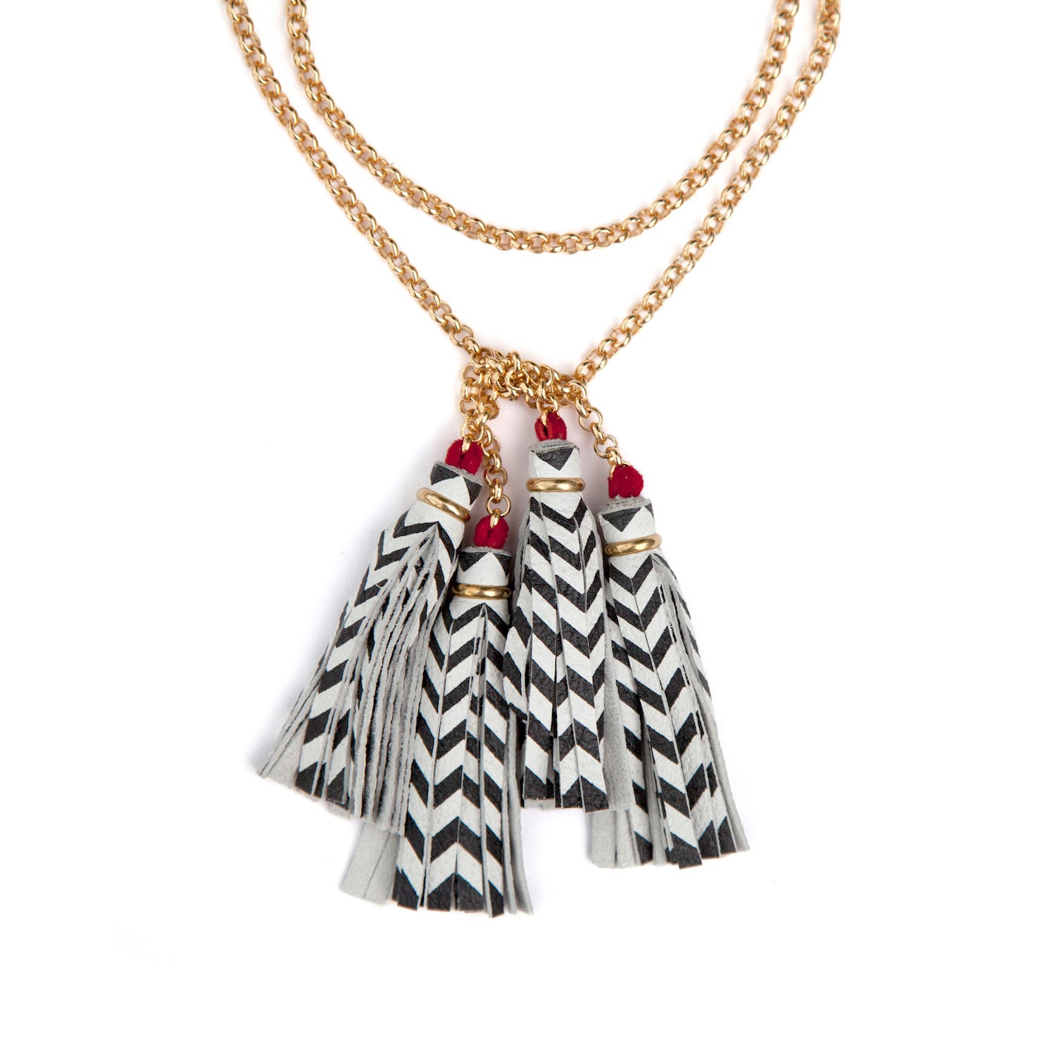 The iconic black & white chevron floor of the black lodge is translated into these luxurious soft suede leather tassels, screen -printed, hand-cut and held in place by golden rings (just as the disappearance of Coopers ring held his faith in the giants clues).