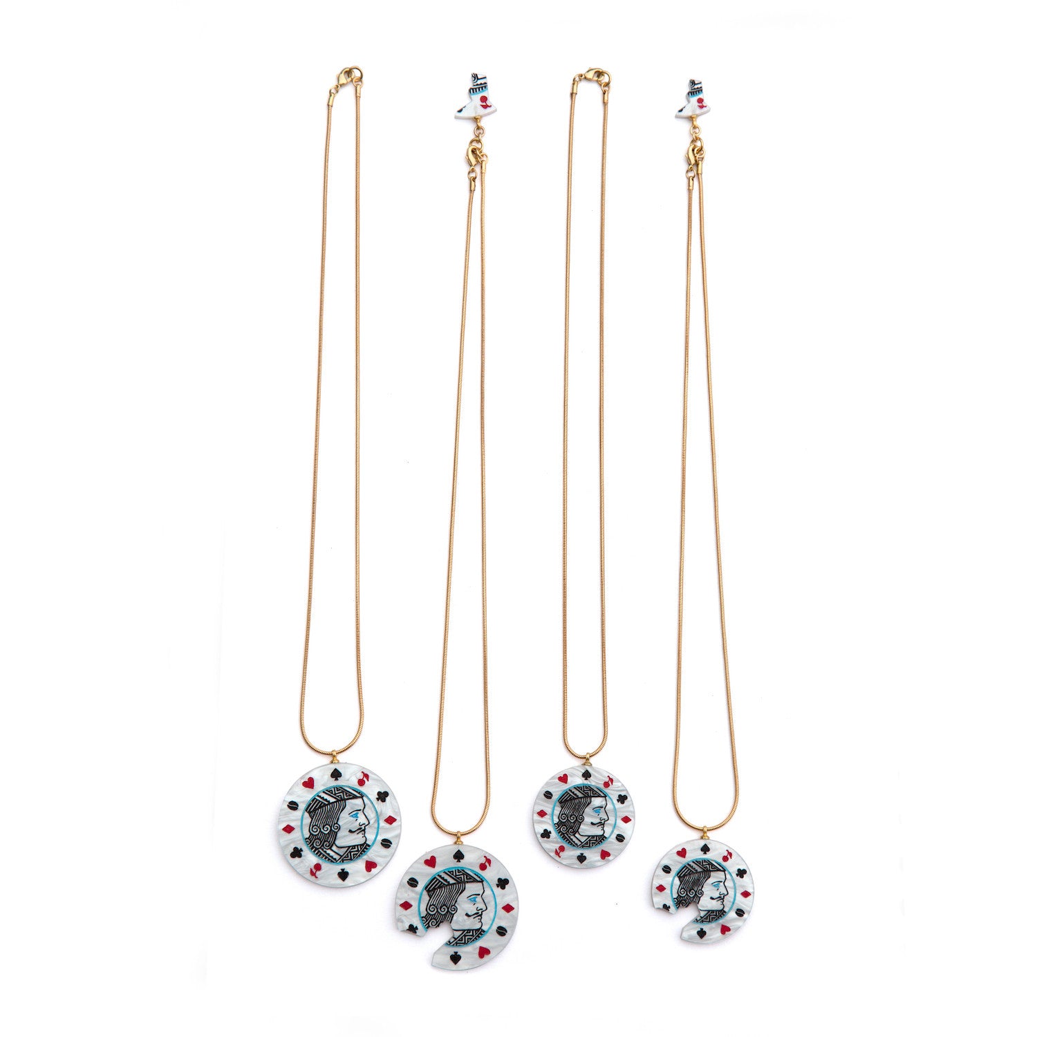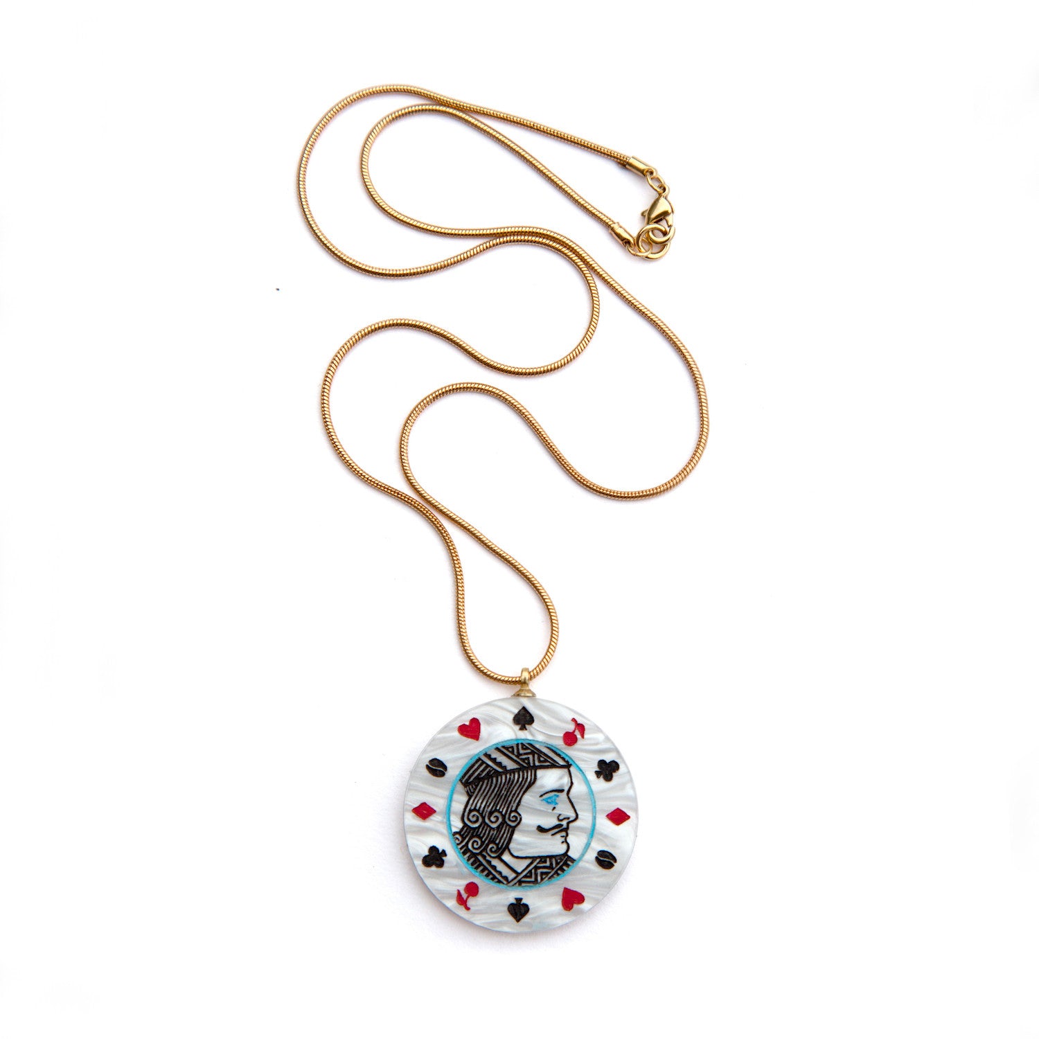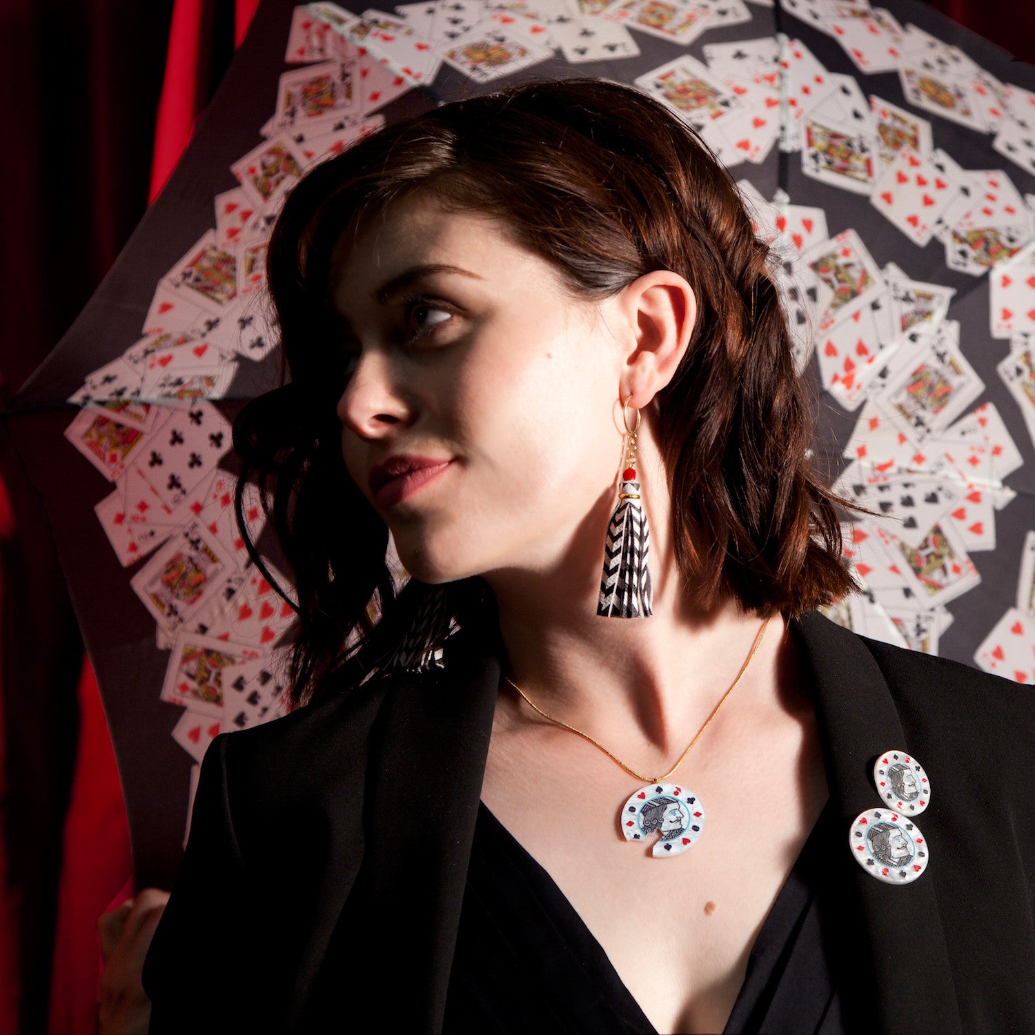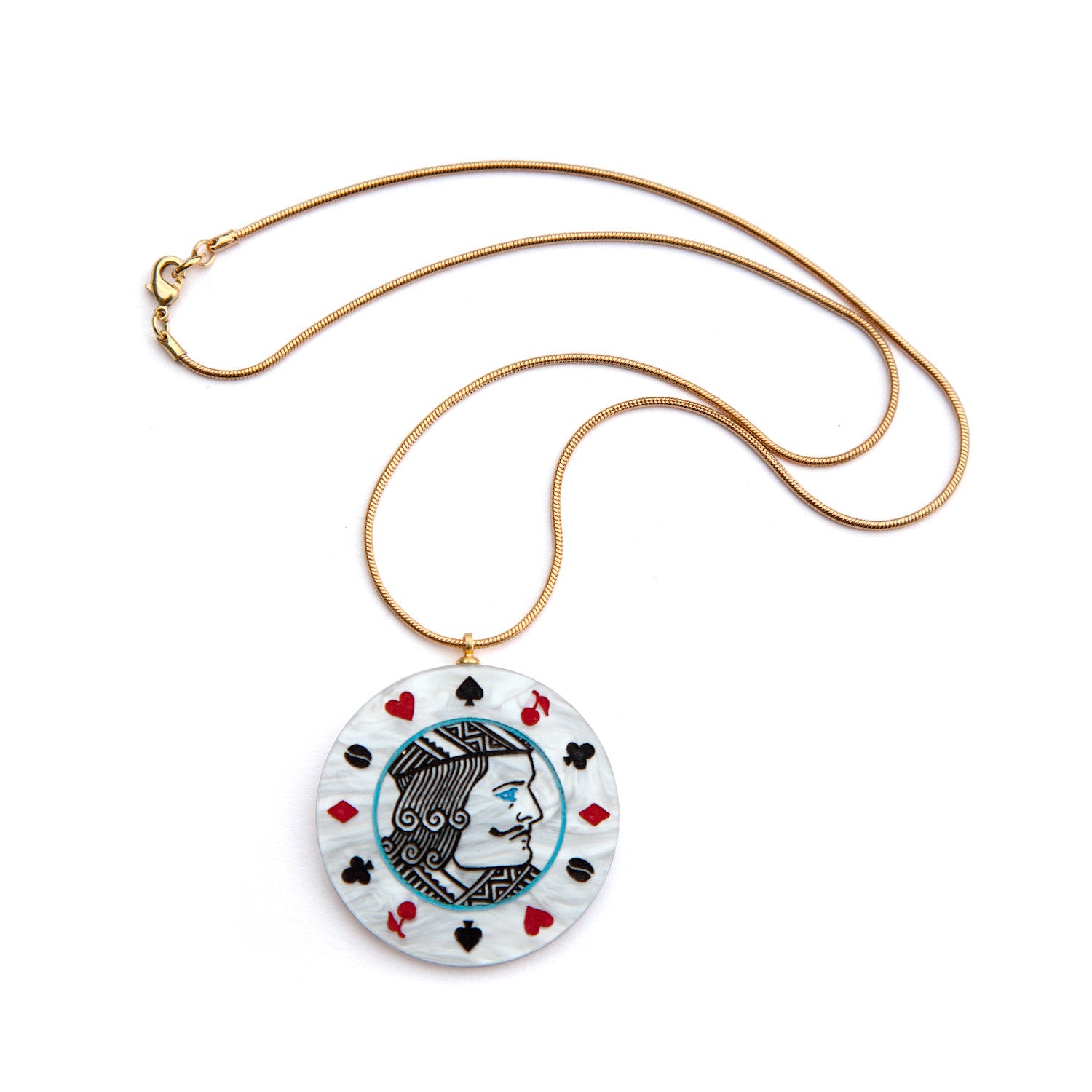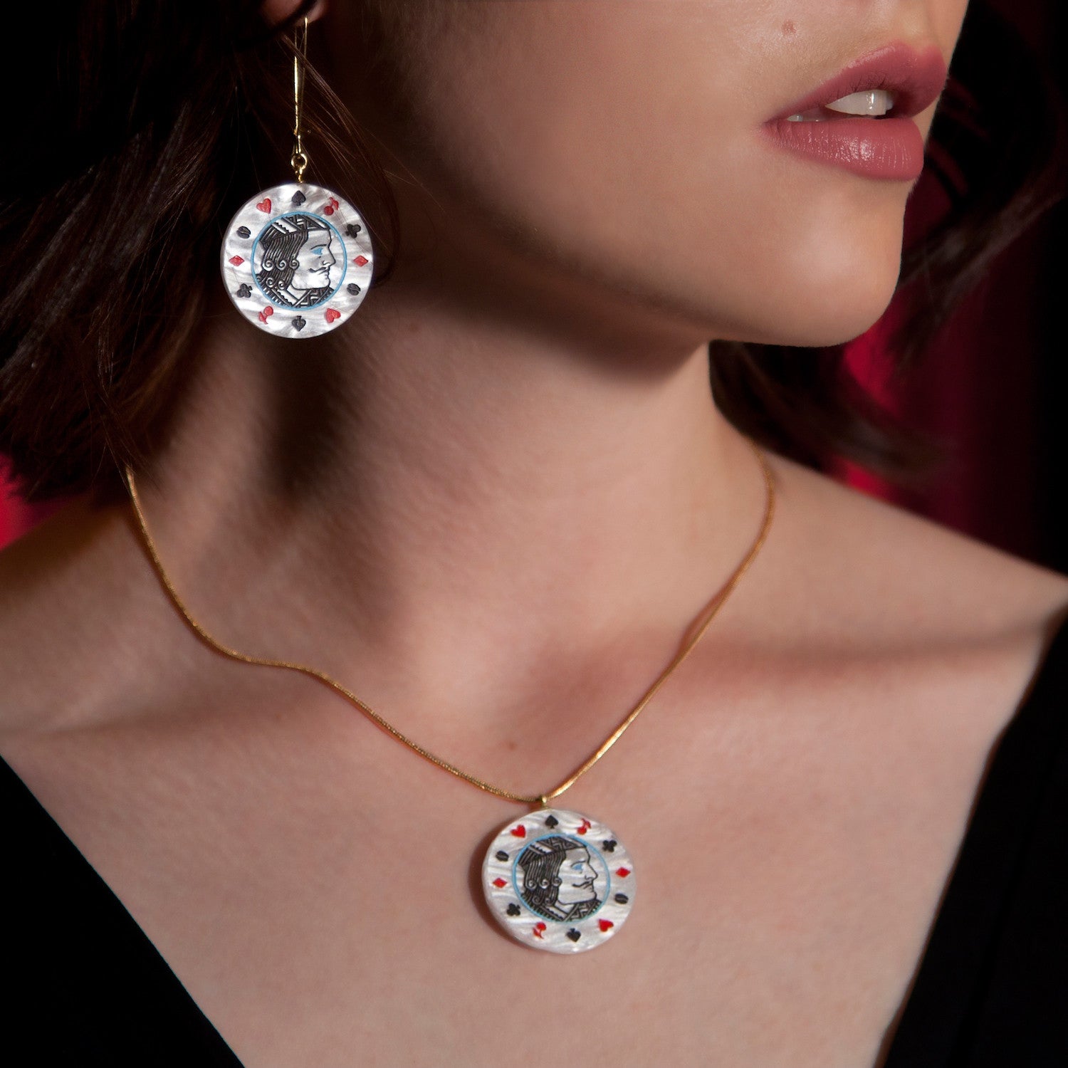 These casino chip pendants, in nod and a wink to One Eyed Jack's, are made from beautiful mother of pearl lucite, and adorned with a black Jack (doesn't he look almost exactly like our most special agent?), framed by a thin ring of neon blue, playing card suits, cherries & little black coffee beans. On the reverse is Waldo, the doomed witness, flanked by golden flames. The illustrations are machine-engraved before being carefully hand painted.