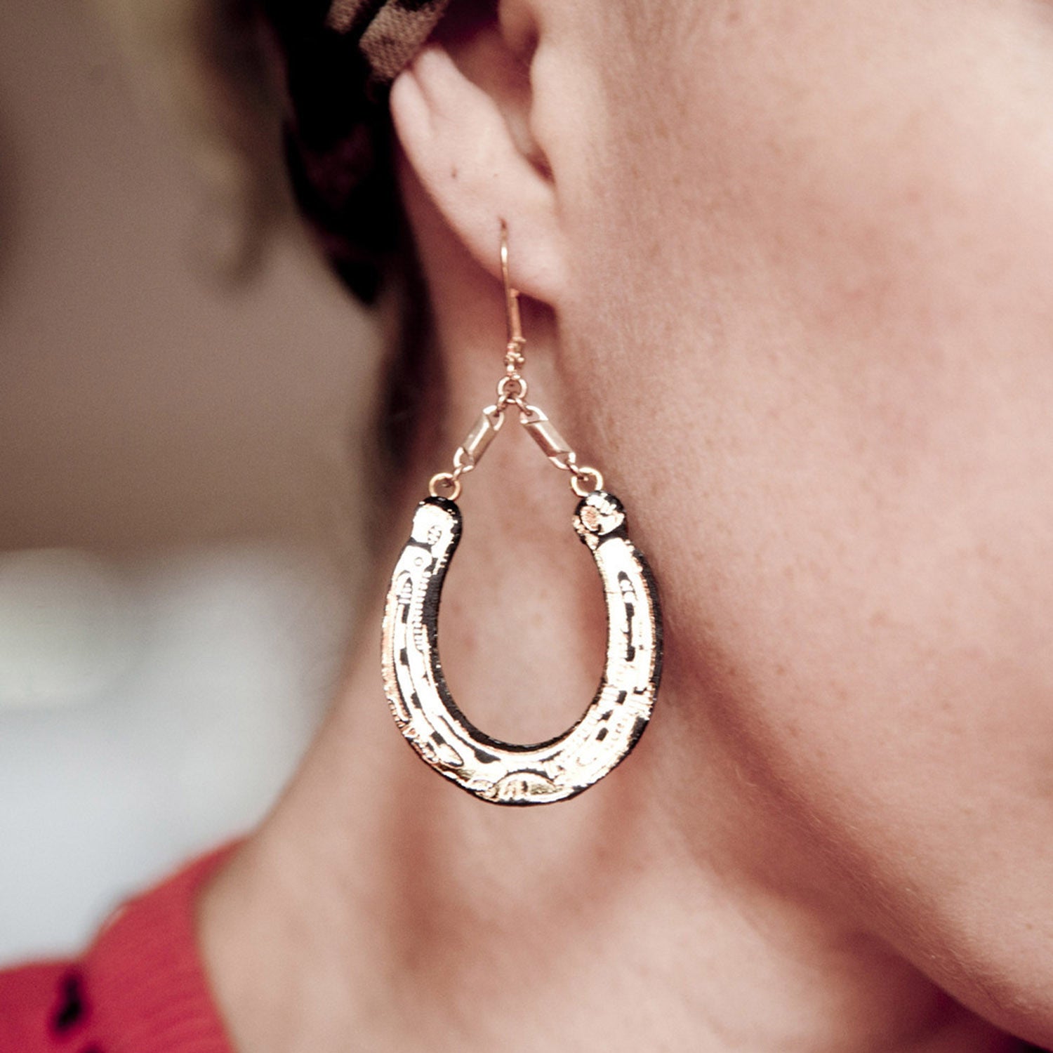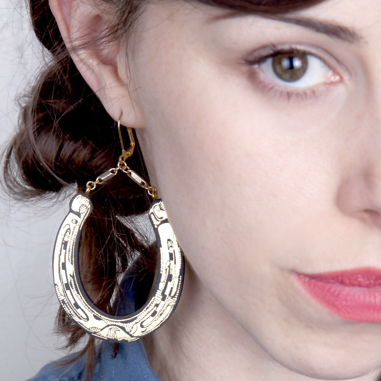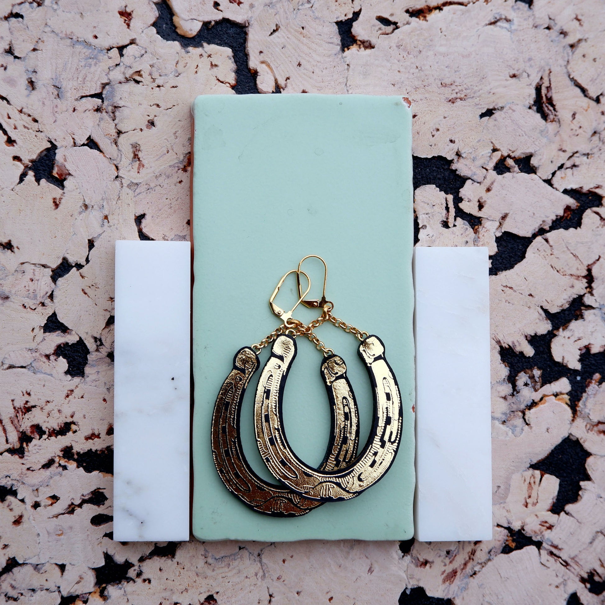 Dazzling gold foil-embossed light-weight horseshoes, hang from gold plated bar chain & lever-back hooks.