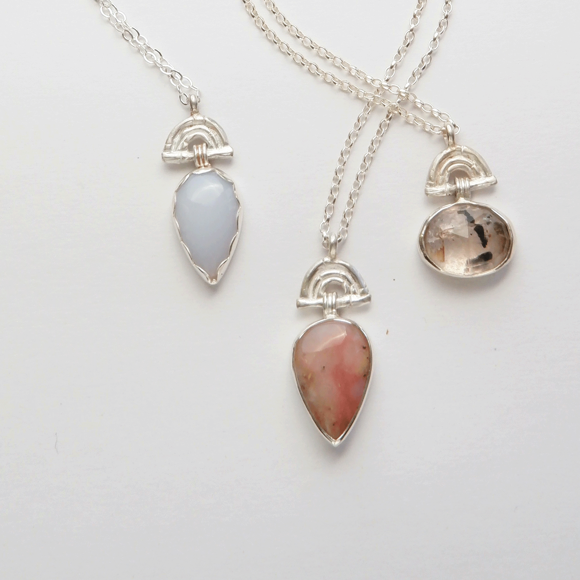 These modern amulets, with echoes of ancient cultures, are centred around beautiful semi-precious stones. These are chosen for their colour, as well as individual characteristics - mellow mid-tones, punchy pastels, earthy neutrals, bold blacks and milky whites, often patterned with inclusions of marbling, speckles or swirls. The gemstones, formed by epic forces and natural mineral magic, are hidden underground for millennia, before incredibly, been unearthed, transported, cut, polished and made in to timeless treasures for you to keep close, and hold dear.