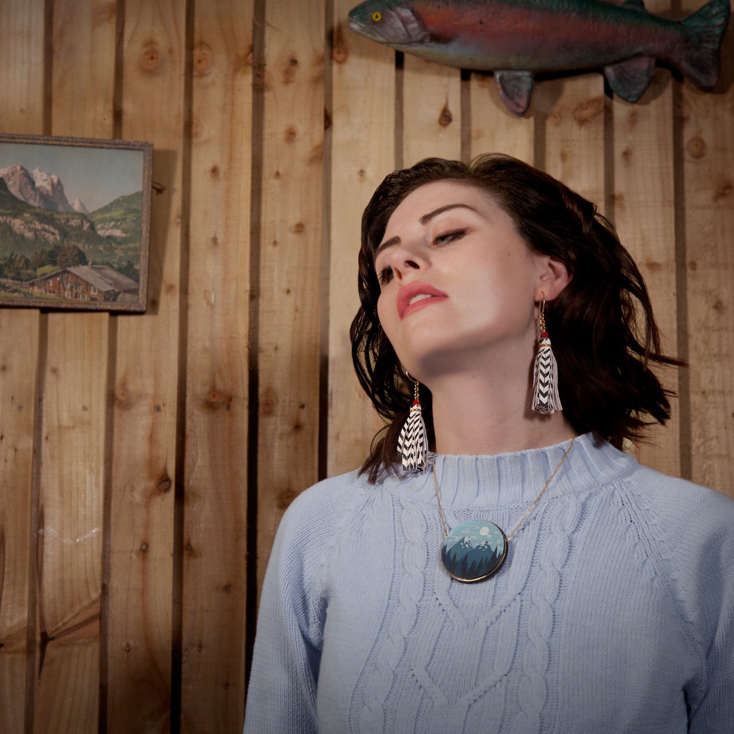 A rugged moonlit landscape is silk-screened on to wooden circles - twin snow-capped peaks rising from a forest of majestic douglas firs.