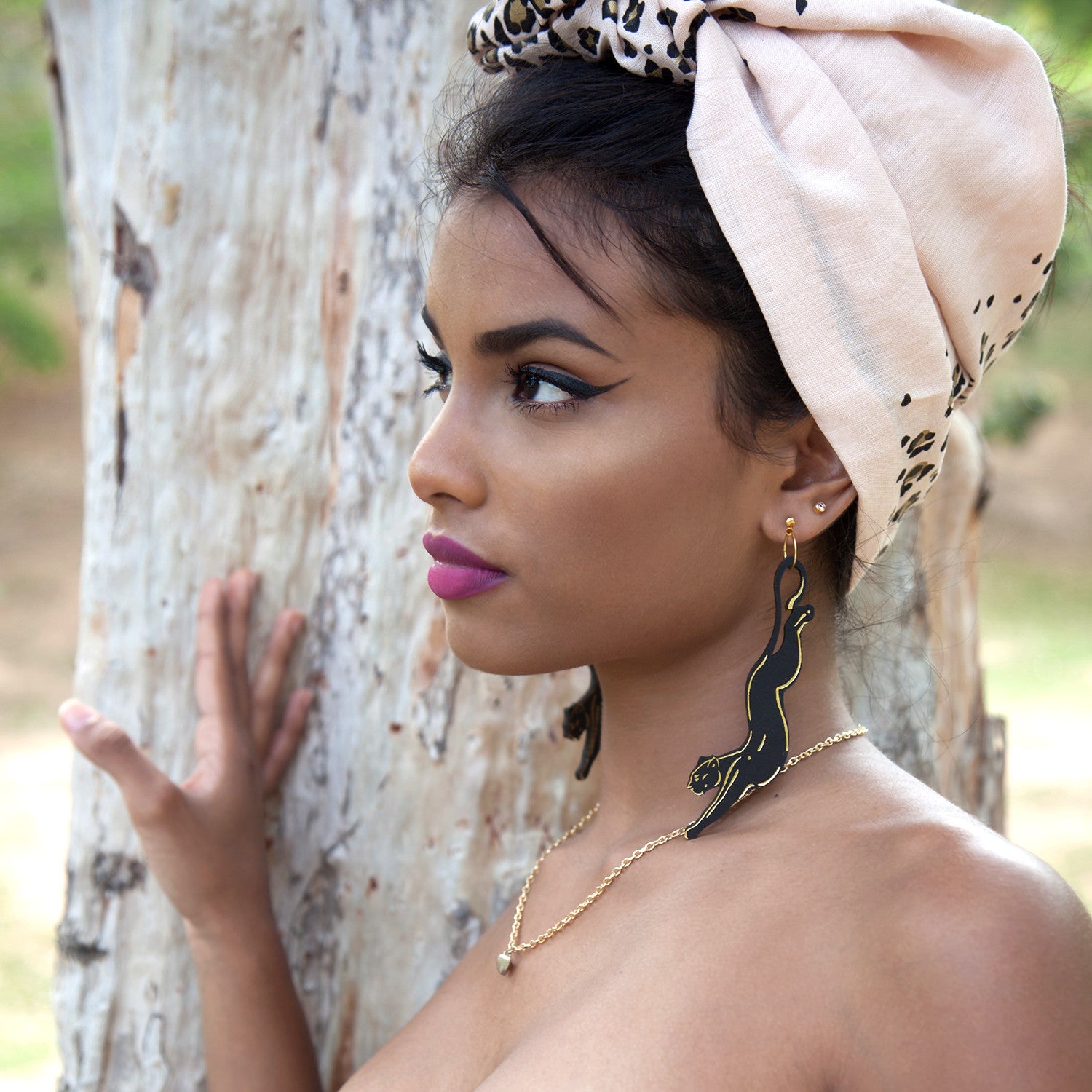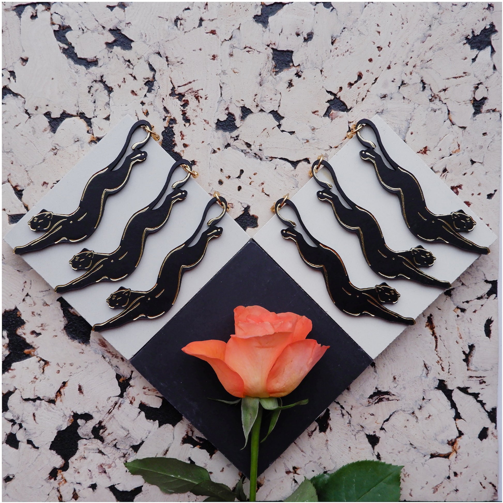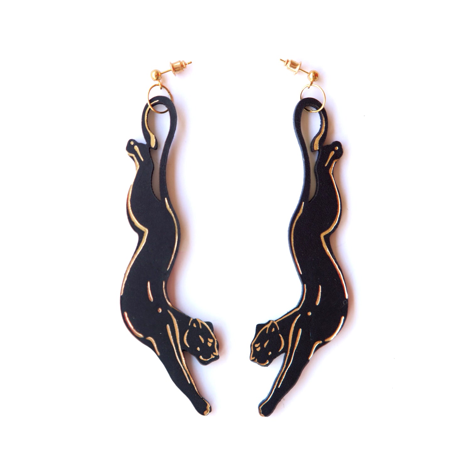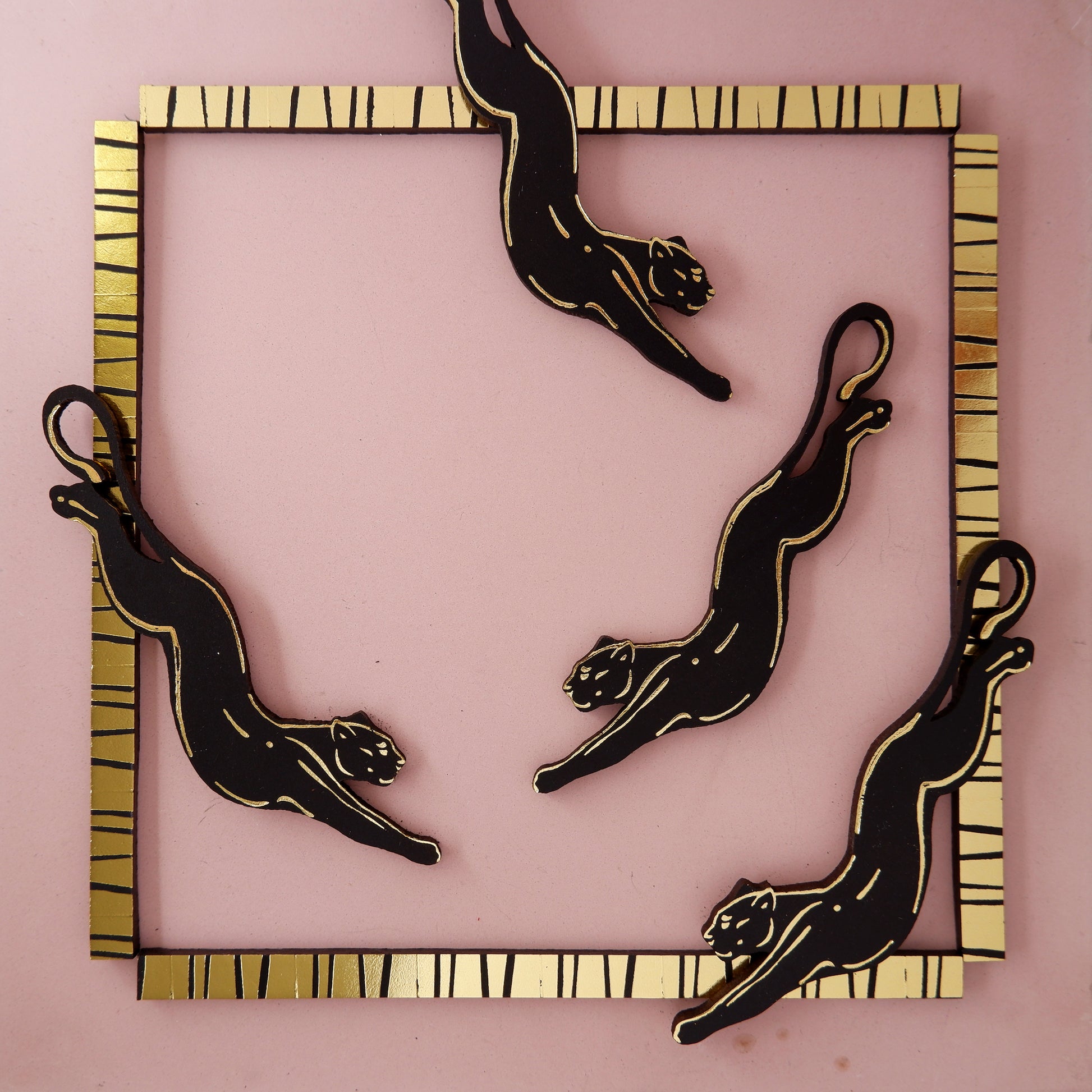 Inspired by sleek and handsome art deco jungle cats that have graced everything from mantelpieces to roaring motor cars, these glorious beasts are cut from luxurious black leather and handprinted with swooping streaks of shiny gold.